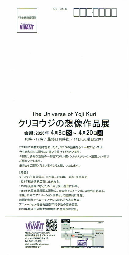 Yoji Kuri, an animation filmmaker and manga artist who passed away in 2024 at the age of 96, continues to inspire us with his unparalleled sense of humor, offering endless laughter and insight. This exhibition introduces a portion of his diverse creative output through acrylic paintings, silkscreen prints, manga illustrations, and more.
