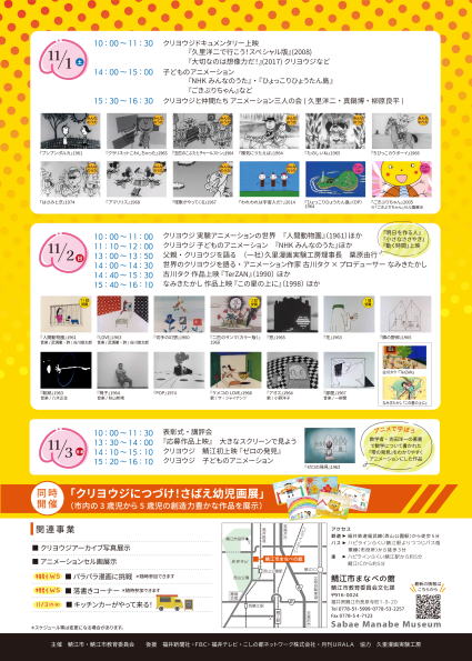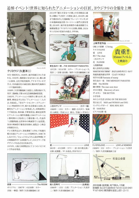 主催:クリヨウジ グッパイ上映会実行委員会TEL03(5761)8924 後援:日本アニメーション協会(JAA)・Art Space Kimura ASK?(木邑芳幸) 作品提供:一般社団法人久里実験漫画工房 司会:山田典子 制作:佐藤史菜 協力:アニドウ 映写:鈴木映画 実行委員:栗原由行・古川タク・巻島清二・吉野ナオコ・山中幸生・なみきたかし 料金(当日)¥3,000 (予約)2,500