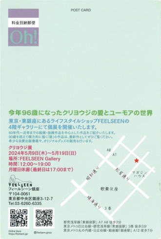 2024年5月9日(木)~5月19(日) FEELSEEN Gallery 〒104-0061 東京都中央区銀座3-12-7 時間:12:00~19:00 月曜日休廊(最終日は17:00まで) TEL:03-6260-6335 今年96歳になったクリヨウジの愛とユ-モアの世界